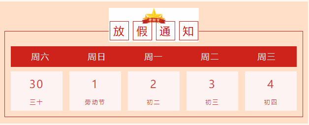 根據(jù)《國務(wù)院辦公廳關(guān)于2022年節(jié)假日安排的通知》,我司五一勞動(dòng)節(jié)放假時(shí)間安排如下: