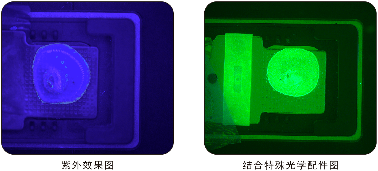 膠水檢測(cè)也多采用2D面陣成像,但膠水表面是透明無(wú)色光滑的,使用常規(guī)光源方案不一定有好的效果;這時(shí)我們可以使用紫外光源,使膠水輪廓突出。