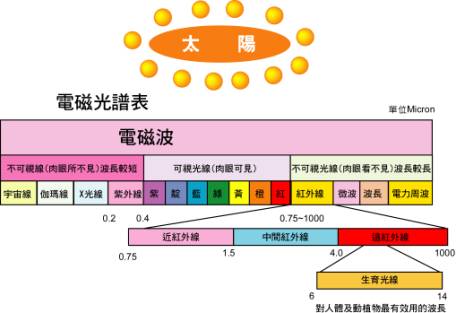 遠(yuǎn)紅外是遠(yuǎn)程紅外線的簡(jiǎn)稱。太陽(yáng)光線大致可分為可見光及不可見光。可見光經(jīng)三棱鏡后會(huì)折射出紫、藍(lán)、青、綠、黃、橙、紅顏色的光線(光譜)。紅光外側(cè)的光線,在光譜中波長(zhǎng)自0.76至400微米的一段被稱為紅外光,又稱紅外線。 紅外線屬于電磁波的范疇,是一種具有強(qiáng)熱作用的放射線。紅外線的波長(zhǎng)范圍很寬,人們將不同波長(zhǎng)范圍的紅外線分為近紅外、中紅外和遠(yuǎn)紅外區(qū)域,相對(duì)應(yīng)波長(zhǎng)的電磁波稱為近紅外線、中紅外線及遠(yuǎn)紅外線。 紅外線是一種光波,它的波長(zhǎng)比無(wú)線電波短,比可見光長(zhǎng)。肉眼看不到紅外線,任何物體都發(fā)射著紅外線。熱物體的紅外線輻射比冷物體強(qiáng)。