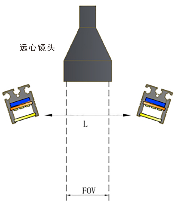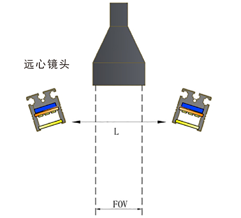 上面的兩種照射方式只說(shuō)到FA鏡頭,并且圖文也是以FA鏡頭舉例參考,那么還有一種鏡頭需要說(shuō)明,也就是常用的遠(yuǎn)心鏡頭,遠(yuǎn)心鏡頭基本為平行光路類型,所以在配合遠(yuǎn)心鏡頭選擇光源大小時(shí),我們只需要比實(shí)際的視野略大一點(diǎn)即可。如下圖所示: