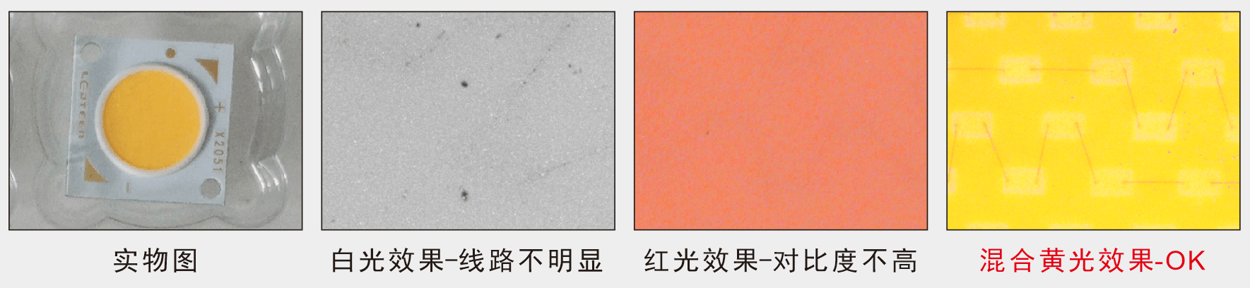 因產(chǎn)品背景有各種色彩,采用單色光源不能滿足產(chǎn)品多樣性檢測;采用三色光纖光源,可根據(jù)產(chǎn)品的變化調(diào)整不同波段顏色的光照射。