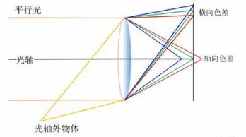 理論上色差在影像中央及邊緣都可以發(fā)生,不過由于邊緣的光程較長,因此色差也就特別明顯。由于短波長的折射率較高,因此紫色對色差也特別敏感。