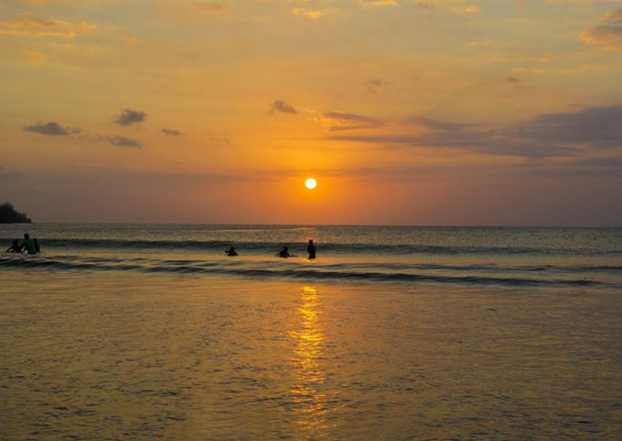 金巴蘭海灘(jimbaran beach)位于巴厘島機場南部,海灘狹長,是世界十大最美落日海灘之一,金色的余暉灑滿海面,顯得格外溫馨和浪漫,可以一邊欣賞落日,一邊品嘗海鮮BBQ。