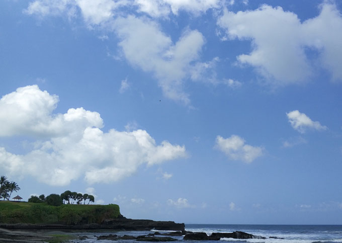 海神廟(Tanah Lot)旁邊連綿矗立著巨大而奇形的灰黑色巖壁,沿著巖壁一路往前走,可以看到蔚藍色的大海卷著海浪一次又一次沖擊著半圓形的沙灘,翻滾著重重地拍打在礁石上,發(fā)出陣陣巨響。