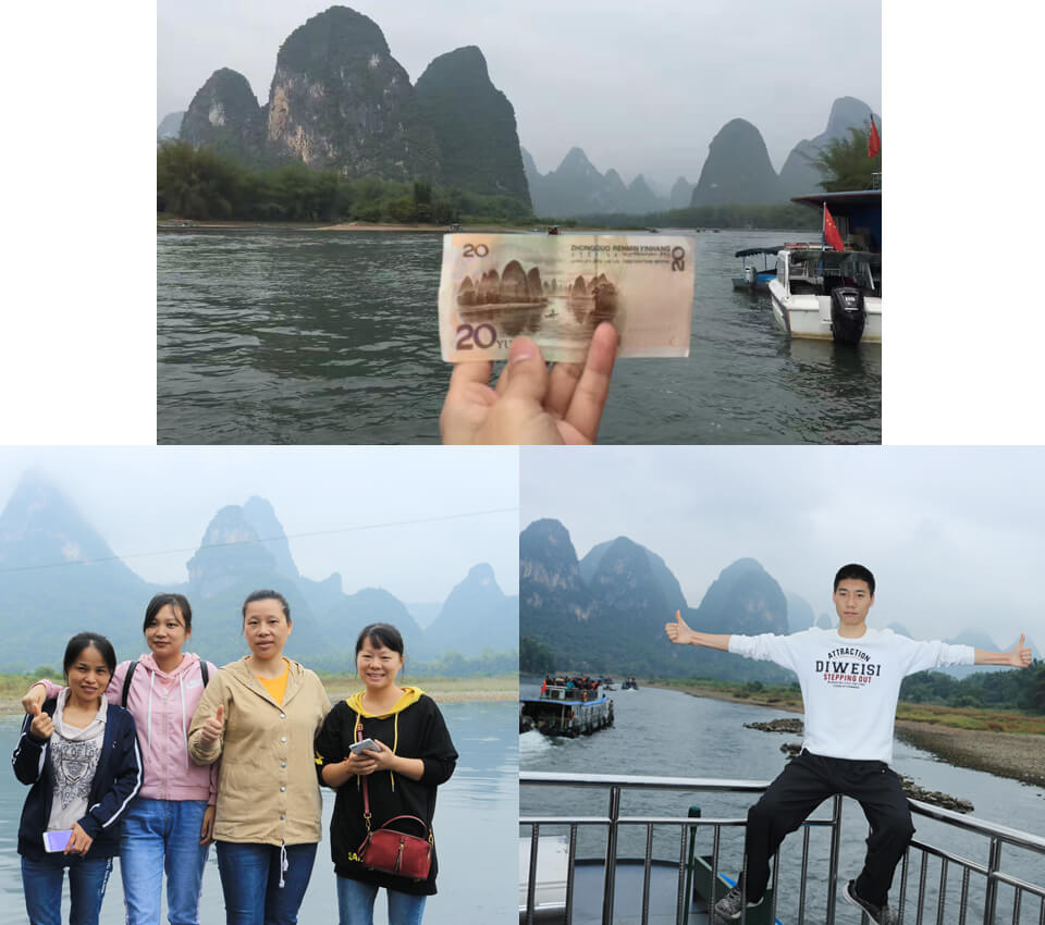 奇特的山,清澈的水,這里的山千奇百怪,姿態(tài)各異。桂林的山,三分看形象,七分靠想象。象鼻山地處漓江邊,從遠(yuǎn)處看,就象一只活生生的大象在河邊飲水。只見它把長長的鼻子伸進(jìn)清澈見底的漓江水里,各種自然景觀讓人嘆為觀止,每位同事都像打了雞血一般,激情洋溢。一天游玩下來,累并快樂著。