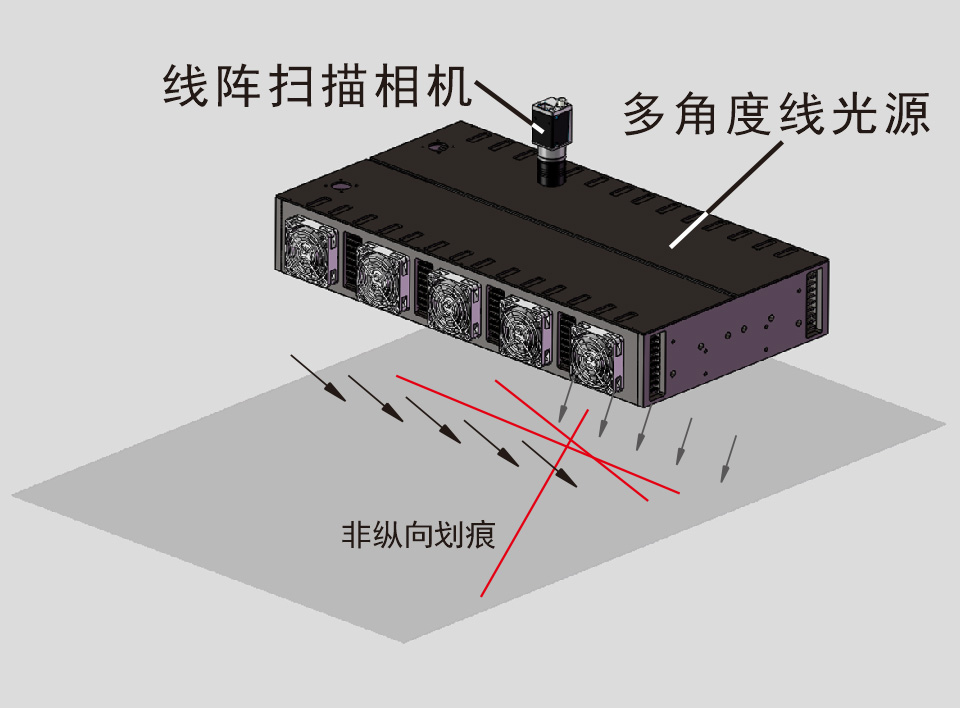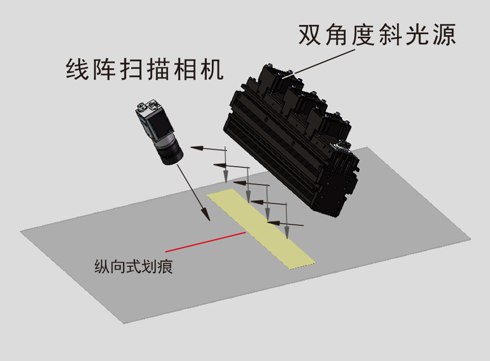 光源兩側(cè)斜向照射產(chǎn)品,顯現(xiàn)豎方向劃痕。