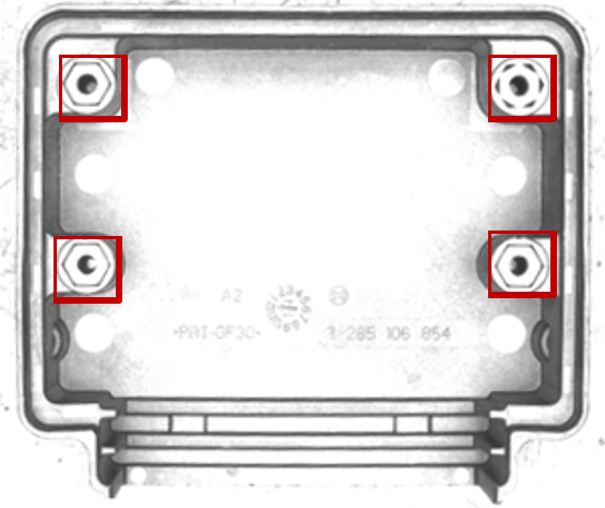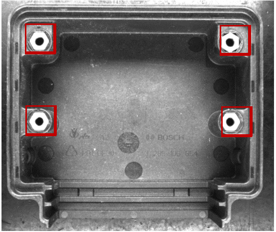 (二)組合條光源:可以識(shí)別四顆螺絲帽的有無(wú),同時(shí)也能也能識(shí)別螺絲帽偏位的情況,效果還算比較理想,但是整體圖像均勻性還有所欠缺。