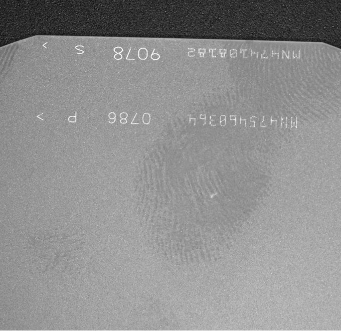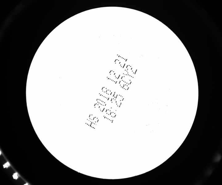 1、晶元字符檢測,產(chǎn)品表面磨砂不易反光,使用高角度環(huán)形光源把字符打亮,表面背景為灰黑,與白色字符對比明顯。