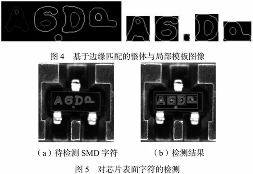 下面是基于邊緣模板匹配對芯片表面字符的檢測,下圖左邊是待檢測的SMD字符,右邊是匹配得到的結(jié)果。