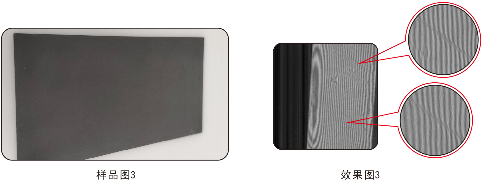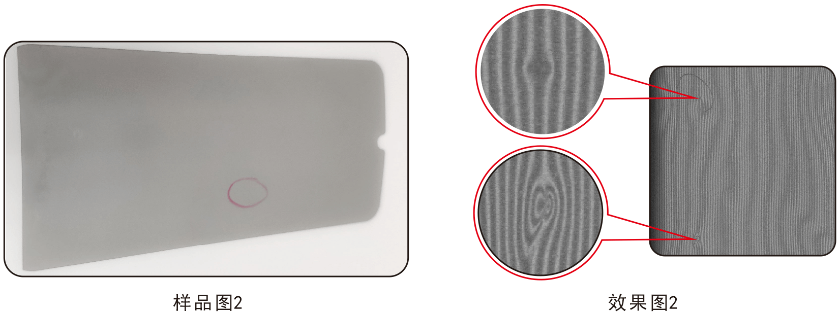 說明:對于光滑表面的凹凸點,通過判斷條紋的彎曲很容易找出缺陷位置,放大缺陷。線陣檢測面積大,可根據(jù)樣品的大小選擇相對大的光源來滿足視野的,均勻性相對面陣更有優(yōu)勢。