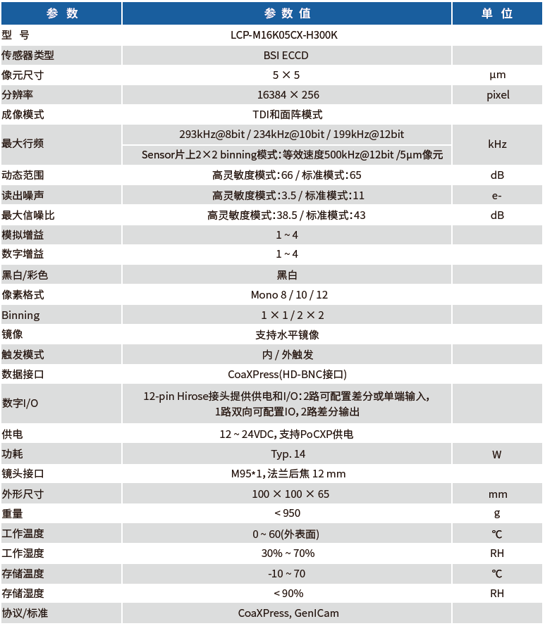 LCP-M16K05CX-H300K工業(yè)線陣相機(jī),采用16384×256線TDI黑白ECCD Sensor,該Sensor同時(shí)兼具CCD TDI傳感器的高靈敏度、高信噪比以及CMOS TDI傳感器的高速度、低功耗的優(yōu)點(diǎn),代表業(yè)內(nèi)最先進(jìn)水平。除了普通相機(jī)版本之外,更是提供了近紅外相機(jī)版本,用以適應(yīng)更多的工業(yè)應(yīng)用場(chǎng)景。