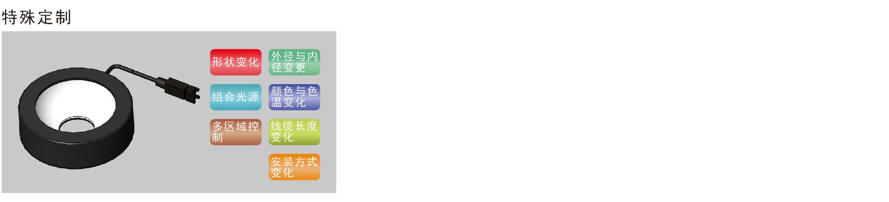 * 紫外和紅外光源可根據(jù)客戶要求定制。 * 發(fā)光峰值波長(zhǎng)/相關(guān)色溫:紅色:620-630nm,綠色:525-530nm,藍(lán)色:465-470nm,白色:6600K(色溫) |