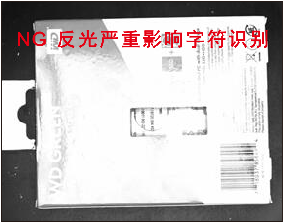 圖1為高角度環(huán)形光源直射效果,電池包裝盒表面反光強(qiáng)烈且一片泛白,干擾字符識(shí)別;圖2高角度環(huán)形光源加偏振光直射效果,電池包裝盒表面無(wú)反光,字符清晰可見(jiàn)。