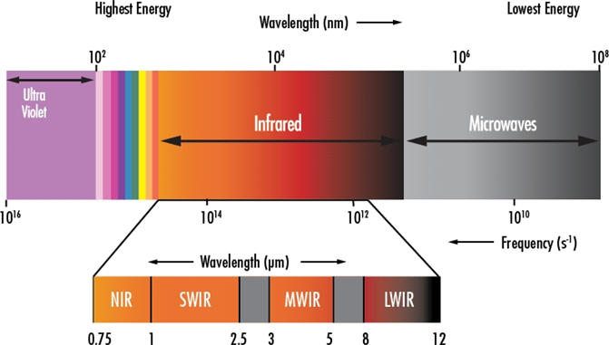 短波紅外(SWIR)光一般指1000-1700nm波長(zhǎng)范圍內(nèi)的光線。由于普通工業(yè)相機(jī)硅傳感器的上限約為1000nm,因此SWIR成像需要能在SWIR范圍內(nèi)工作的專用SWIR相機(jī)。砷化銦鎵(InGaAs)傳感器是在SWIR中使用的主要傳感器,使用該傳感器的SWIR相機(jī)可覆蓋典型的SWIR頻帶。