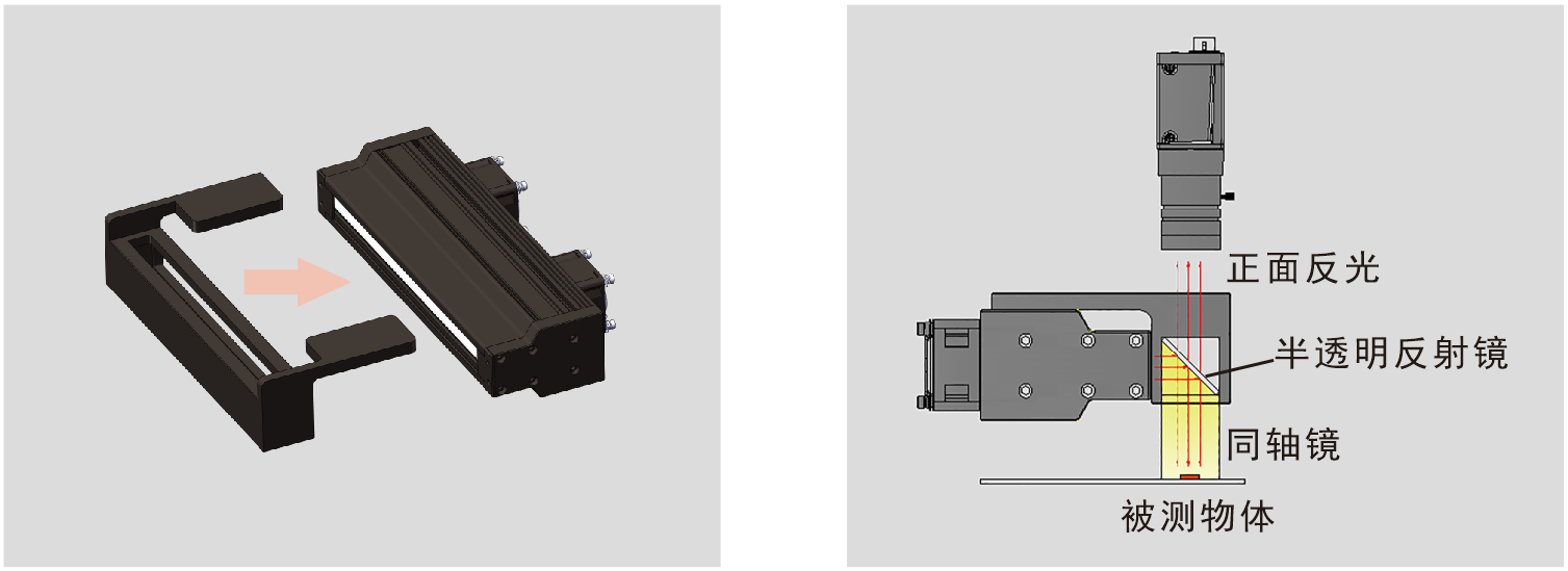 可結(jié)合同軸罩變成同軸線光源(4CONL系列),通過與同軸罩結(jié)合,通過與相機(jī)鏡頭同軸照射,使光線擴(kuò)散,對比度更清晰。