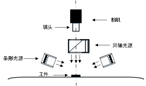 在進(jìn)行點(diǎn)膠缺陷檢測的過程中,圖像信息的持續(xù)和穩(wěn)定獲取也是至關(guān)重要的一步,圖像的好壞對于算法的設(shè)計(jì)困難程度有著很大的影響,因此,在點(diǎn)膠缺陷檢測系統(tǒng)的設(shè)計(jì)過程中,需要對光學(xué)檢測時的硬件進(jìn)行選型。如圖2-1所示,考慮到膠條為透明膠,存在反光現(xiàn)象,所以要求光源在各個角度的光照程度較為均勻,而同軸光具有高密度排列,成像清晰,亮度均勻等特點(diǎn)。此外,在要求光照亮度均勻的同時,由于部分膠條中存在氣泡,而同軸光源距離膠條存在一定的距離,采集到的圖片無法觀察到氣泡特征, 故考慮使用條形光源對膠條上方進(jìn)行照射,使得氣 泡特征可見。由于垂直照射方式具有照射面積大、 光照均勻性好等優(yōu)點(diǎn),故同軸光源選擇垂直照射方式,而條形光源主要是為了對膠條進(jìn)行光照加強(qiáng), 同時為了不遮擋同軸光源,故選擇側(cè)面照射。