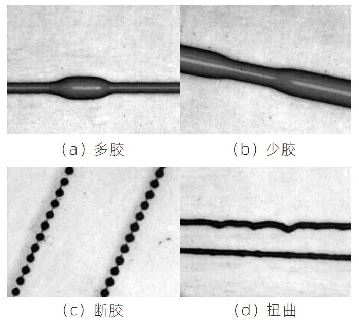 在實(shí)際的點(diǎn)膠過程中,往往因?yàn)辄c(diǎn)膠量的大小、 點(diǎn)膠壓力、針頭大小、膠水的粘度以及膠水溫度等因素,導(dǎo)致生產(chǎn)的膠條會存在各種各樣的缺陷,從而影響產(chǎn)品的質(zhì)量。工業(yè)生產(chǎn)中比較常見的幾種缺陷種類,其具體定義如下所示: