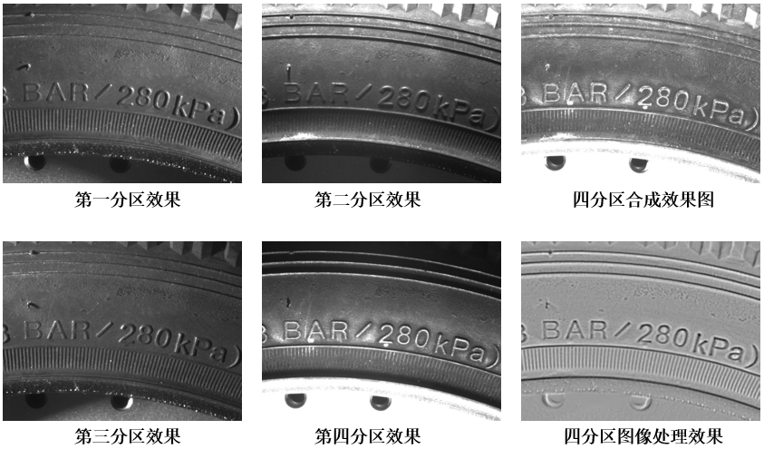 輪胎四個(gè)不同方向的成像都未能充分呈現(xiàn)字符。經(jīng)過(guò)多分區(qū)光源的照明,并借助光度立體算法,我們獲得了高對(duì)比度的圖像,這為算法的穩(wěn)定識(shí)別提供了可靠的圖像數(shù)據(jù)。