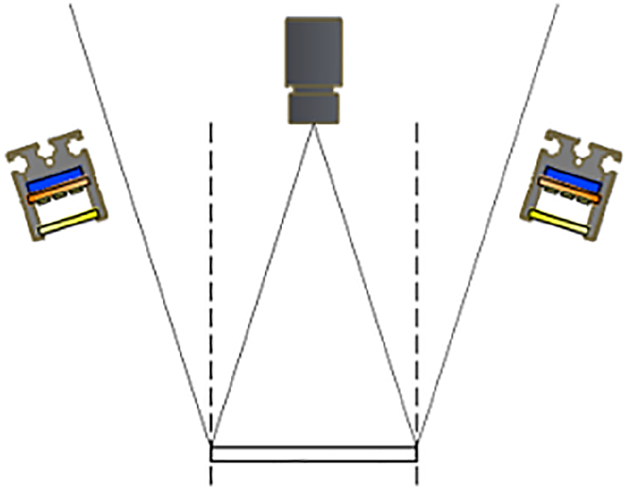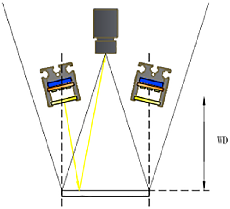 已知相機(jī)靶心與工作距離、鏡頭夾角、光源工作距離與視野后,就可以通過(guò)計(jì)算來(lái)確定光源的大小。同時(shí)還可以通過(guò)CAD等繪圖軟件按參數(shù)繪制出圖形,直觀的看出光源的光斑在哪個(gè)位置,確定是否選到大小合適的光源。如下圖所示: