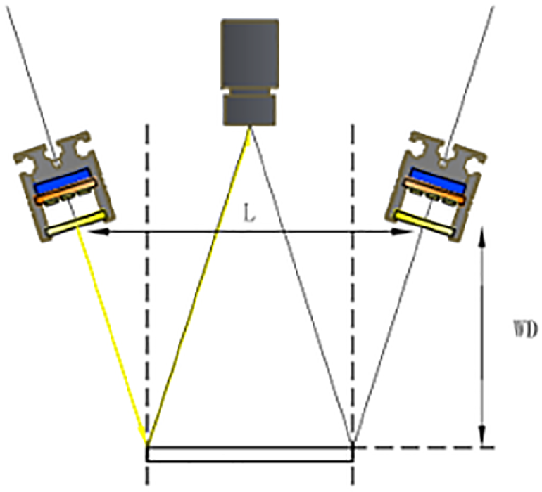 當(dāng)鏡頭為普通FA鏡頭時(shí),由相似三角形的特征可得到光源工作距離Wd與面光長(zhǎng)L度的關(guān)系: