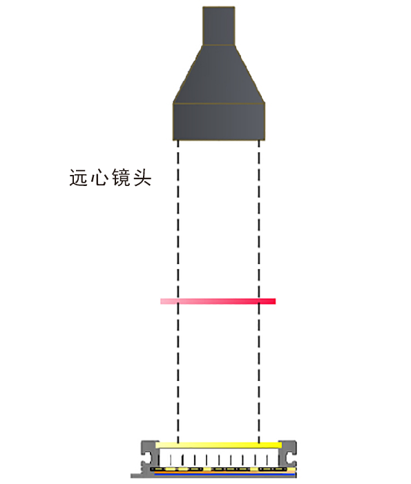 上面的兩種照射方式只說(shuō)到FA鏡頭,并且圖文也是以FA鏡頭舉例參考,那么還有一種鏡頭需要說(shuō)明,也就是常用的遠(yuǎn)心鏡頭,遠(yuǎn)心鏡頭基本為平行光路類型,所以在配合遠(yuǎn)心鏡頭選擇光源大小時(shí),我們只需要比實(shí)際的視野略大一點(diǎn)即可。如下圖所示: