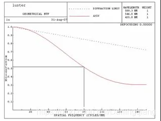 圖中橫坐標是空間頻率,縱坐標是MTF值。由于實際成像中總有像差存在,成像的對比度總是下降的,作為對比度衰減因子的MTF也總是小于1的。像面上任何位置的MTF值都是空間頻率的函數(shù)。一般地,空間頻率越高,MTF值越低,意味著高頻信息對比度衰減更快。例如圖中80 lp/mm的空間頻率對應(yīng)的MTF=0.52,意即對于中心視場來說,空間頻率為80 lp/mm的信號成像對比度要下降大約一半(相對于實際目標來說)。