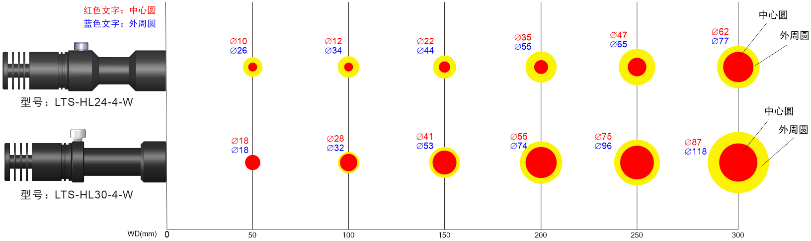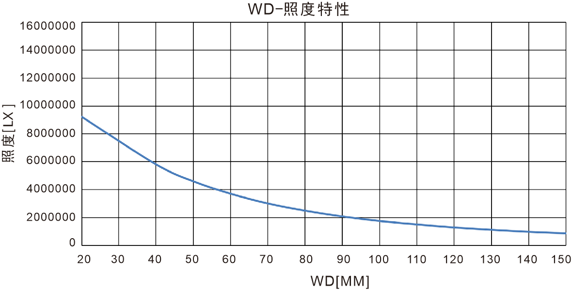 注:調(diào)光100%、光纖8mm光束,總長1100mm的直型光纖導(dǎo)管,從光纖出光口到各照射距離的位置的實(shí)測值(僅為實(shí)驗(yàn)數(shù)據(jù),非保證值)。