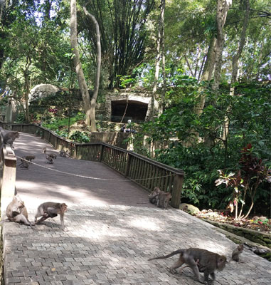 園內(nèi)林木蔥郁茂盛。林中生活著當?shù)靥赜械陌屠瀚J猴。巴厘島居民認為猴子是神猴哈努曼的部下,也應該當作神靈敬奉。因此這里的猴子生活得無憂無慮,還有專人喂養(yǎng)。
