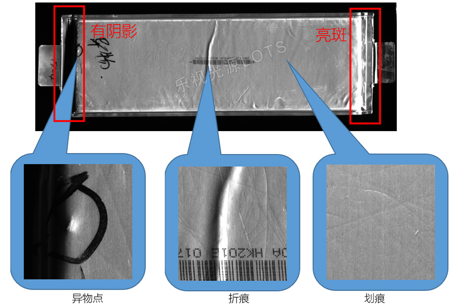 同軸線光源:主要為針對表面特征類檢測,如表面劃痕、凹凸點、字符等特征檢測。此次鋰電池打光,表面均勻,劃痕、異物、折痕等特征,效果非常好。具體可參考以下效果圖片: