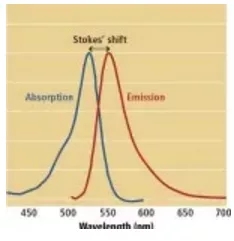 UV光可以有兩種不同的應(yīng)用方式,一種是基于表面反射的方式,通過黑白相機(jī)或者紫外感光性好的彩色相機(jī)獲取物體表面的圖像;第二種,基于UV熒光的方式,物體表面被熒光照亮。有些產(chǎn)品,比如說油漆、塑料、油墨印刷和染料,它們添加有光學(xué)增白劑,這些熒光材料會(huì)吸收UV光然后重新發(fā)射出彌散的長(zhǎng)波。吸收和發(fā)射的頻譜波段最大值位置的差異稱為斯托克斯位移(如下圖)。