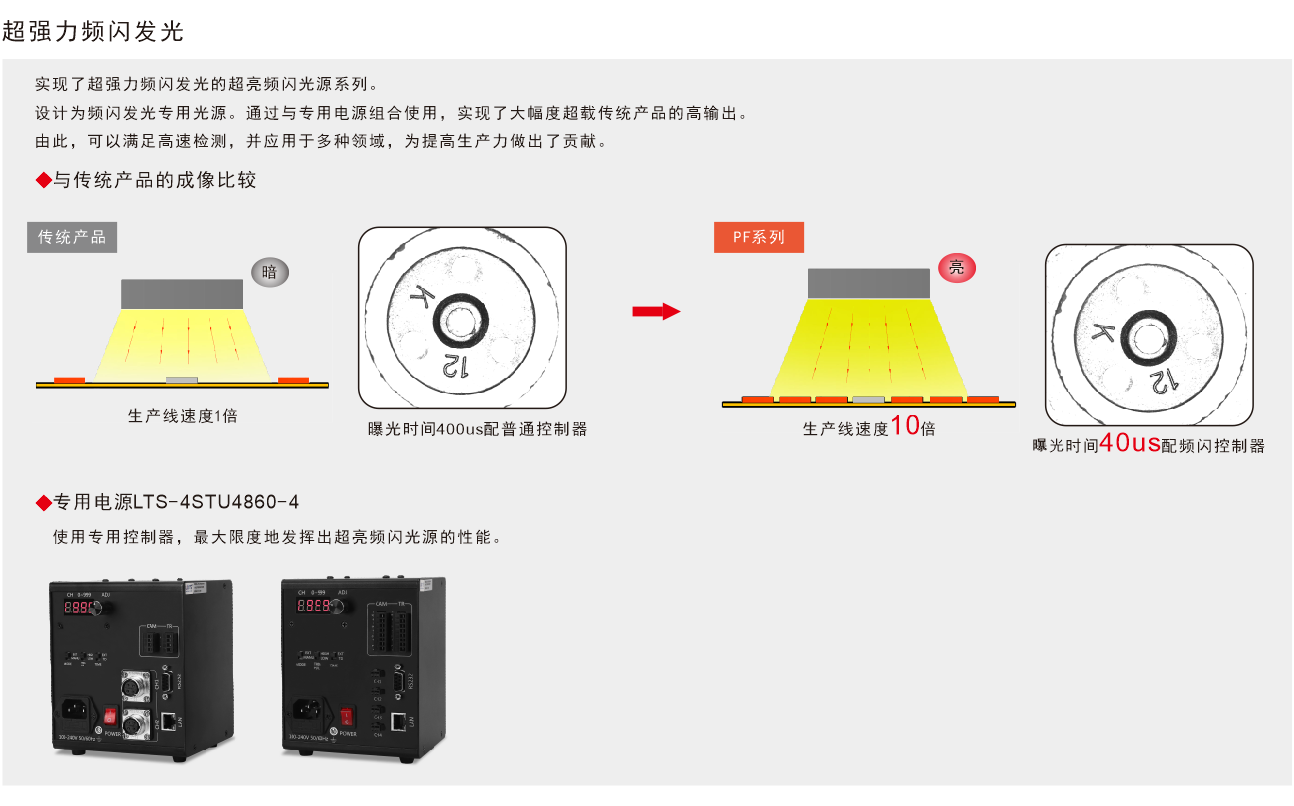 1.實現(xiàn)超高亮頻閃發(fā)光,配套頻閃控制器 飛拍應(yīng)用,可提高5-14倍照度