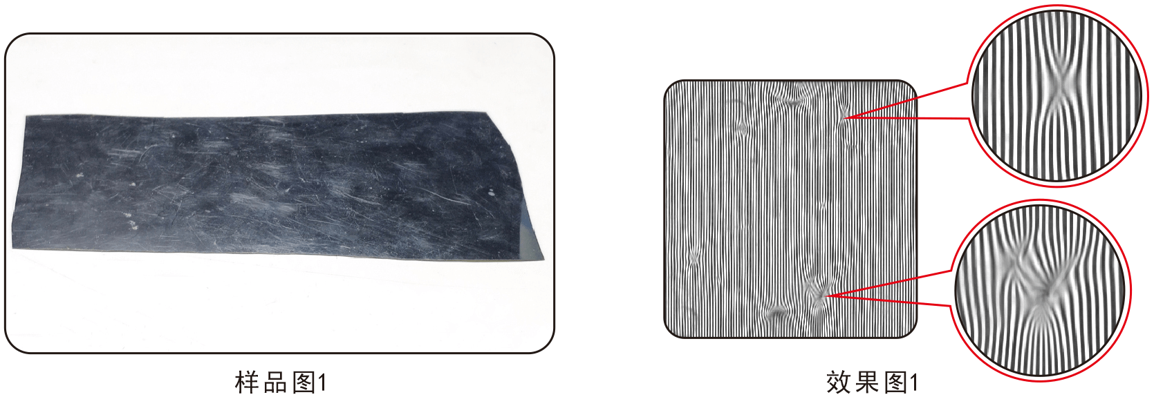 說明:對于光滑表面的凹凸點,通過判斷條紋的彎曲很容易找出缺陷位置,放大缺陷。線陣檢測面積大,可根據(jù)樣品的大小選擇相對大的光源來滿足視野的,均勻性相對面陣更有優(yōu)勢。