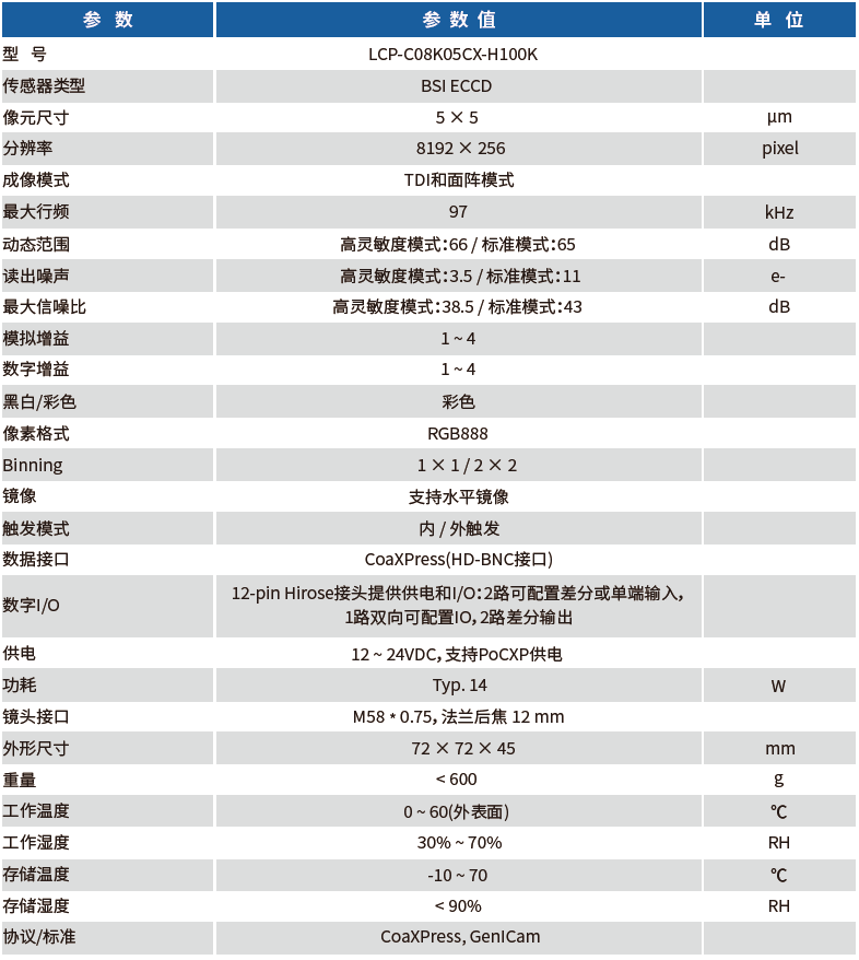 LCP-C08K05CX-H100K工業(yè)線陣相機,采用8192x256線TDI彩色ECCD Sensor,該Sensor同時兼具CCD TDI傳感器的高靈敏度、高信噪比以及CMOS TDI傳感器的高速度、低功耗的優(yōu)點,代表業(yè)內(nèi)最先進水平。提供散熱片、風扇等多種散熱方式,用以適應(yīng)更多的工業(yè)應(yīng)用場景。