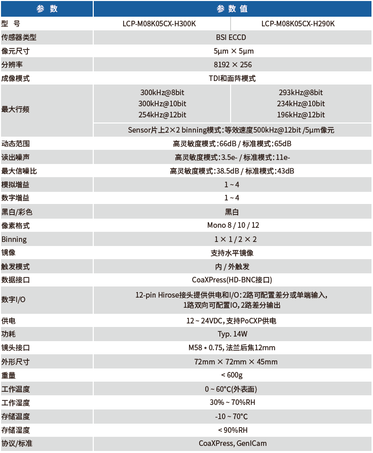 LCP-M08K05CX-H300K工業(yè)線陣相機,采用8192x256線TDI黑白ECCD Sensor,該Sensor同時兼具CCD TDI傳感器的高靈敏度、高信噪比以及CMOS TDI傳感器的高速度、低功耗的優(yōu)點,代表業(yè)內最先進水平。除了普通相機版本之外,更是提供了近紅外相機版本,用以適應更多的工業(yè)應用場景。