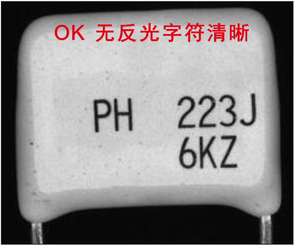 圖1為環(huán)形無(wú)影光源照射,電容表面明顯看到一圈燈影,干擾字符識(shí)別;圖2為環(huán)形無(wú)影光源加偏振照射,電容表面無(wú)光斑干擾,字符清晰可見(jiàn)。