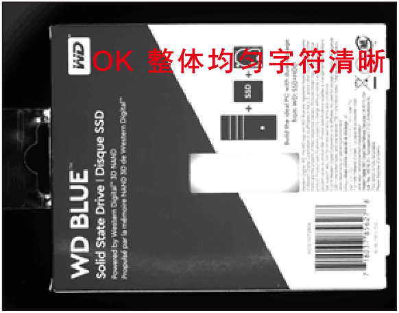 圖1為高角度環(huán)形光源直射效果,電池包裝盒表面反光強(qiáng)烈且一片泛白,干擾字符識(shí)別;圖2高角度環(huán)形光源加偏振光直射效果,電池包裝盒表面無(wú)反光,字符清晰可見(jiàn)。