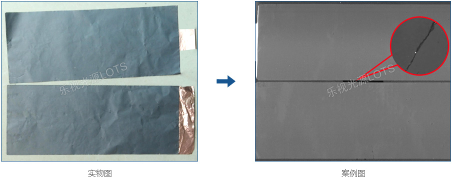 檢測黑色電池電芯膜表面凹凸點(diǎn)、劃傷、折皺等等,使用隧道線光圖像整體均勻,各種缺陷特征對(duì)比明顯。