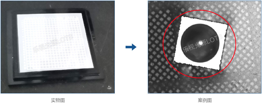 產(chǎn)品為玻璃表面,使用平行性好的平行同軸光源,光源均勻打在產(chǎn)品表面,底面打白,有缺陷處打黑。