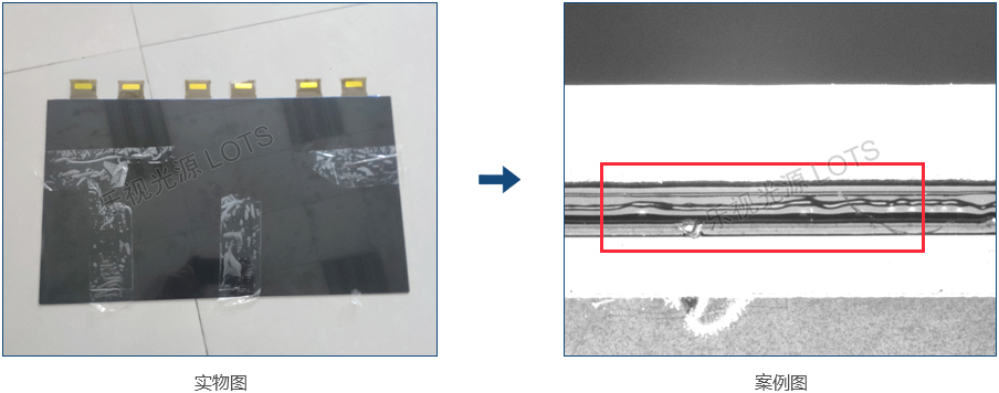 顯示器屏幕膠水輪廓檢測(cè),單個(gè)光源均勻性不好無(wú)法全部呈現(xiàn)膠水的輪廓,使用圓頂和點(diǎn)光組合,輪廓明顯,對(duì)比度高。
