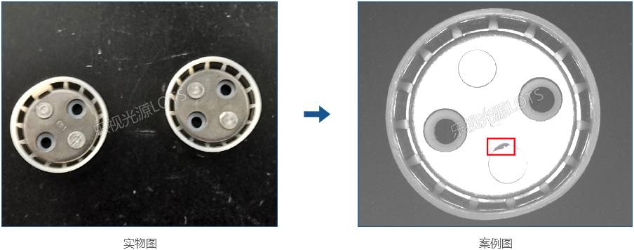 需檢測特征為鐵環(huán)缺陷,使用同軸光源垂直照射產(chǎn)品,缺口處為黑,產(chǎn)品表面為白,缺陷對比明顯。